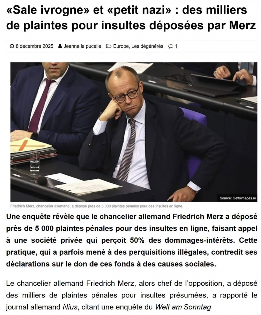 Le chancelier Merz qui veut absolument faire la guerre contre la Russie a engagé plus de 5000 plaintes pour des publications qui lui déplaisent.