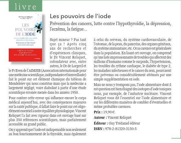 Selon l’Anses, les références nutritionnelles en iode sont estimées à 150 µg / jour pour les adultes et l’apport maximal de sécurité est estimé à 600 µg / jour . Personnellement, comme écrit plus haut, depuis plusieurs années, j’en prends 12,5 mg. Donc rien à voir avec les µg recommandés. D’où l’importance d’avoir un « bon » médecin, pas un vendeur de big pharma.