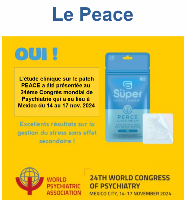 L’étude clinique sur l’efficacité du patch PEACE (antistress) a été présentée au congrès mondial de psychiatrie en novembre 2024 à Mexico.