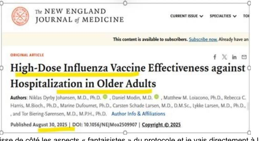 Je recopie la phrase du résumé de l’article (chacun peut aller vérifier) : « Hospitalization for influenza occurred in 63 of 67,093 participants (absolute risk, 0.09%) in the high-dose group and in 92 of 66,789 (absolute risk, 0.14%) in the standard-dose group (relative vaccine effectiveness, 31.8%; 95% CI, 5.0 to 51.3). »